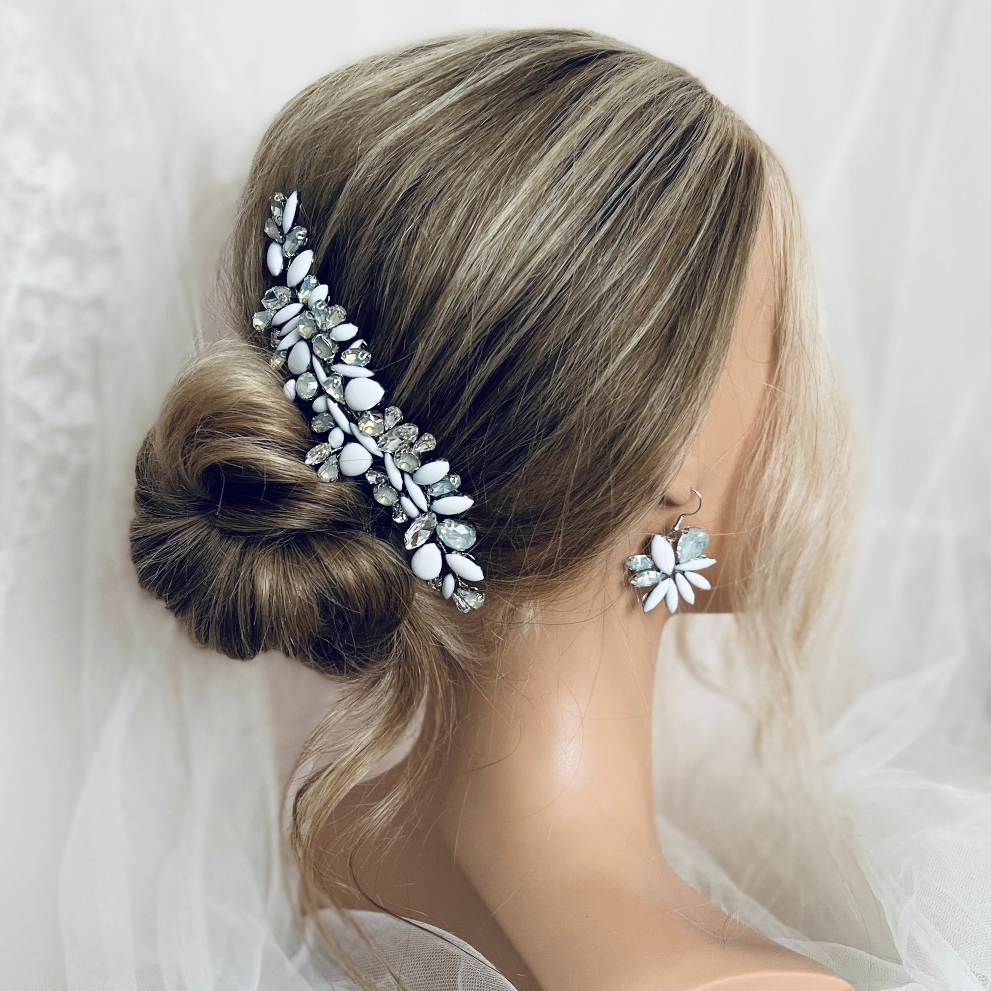 Modern and unique. This gorgeous set of hair comb with matching earrings is perfect for the bride that is after a little something different!