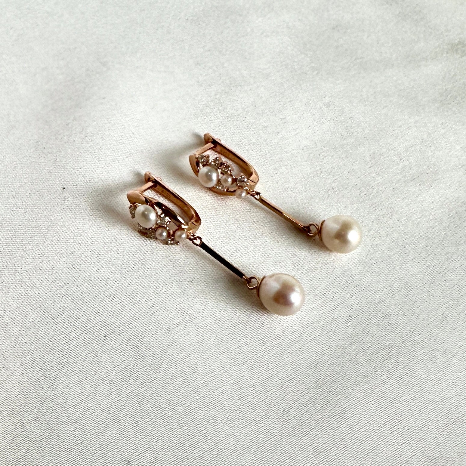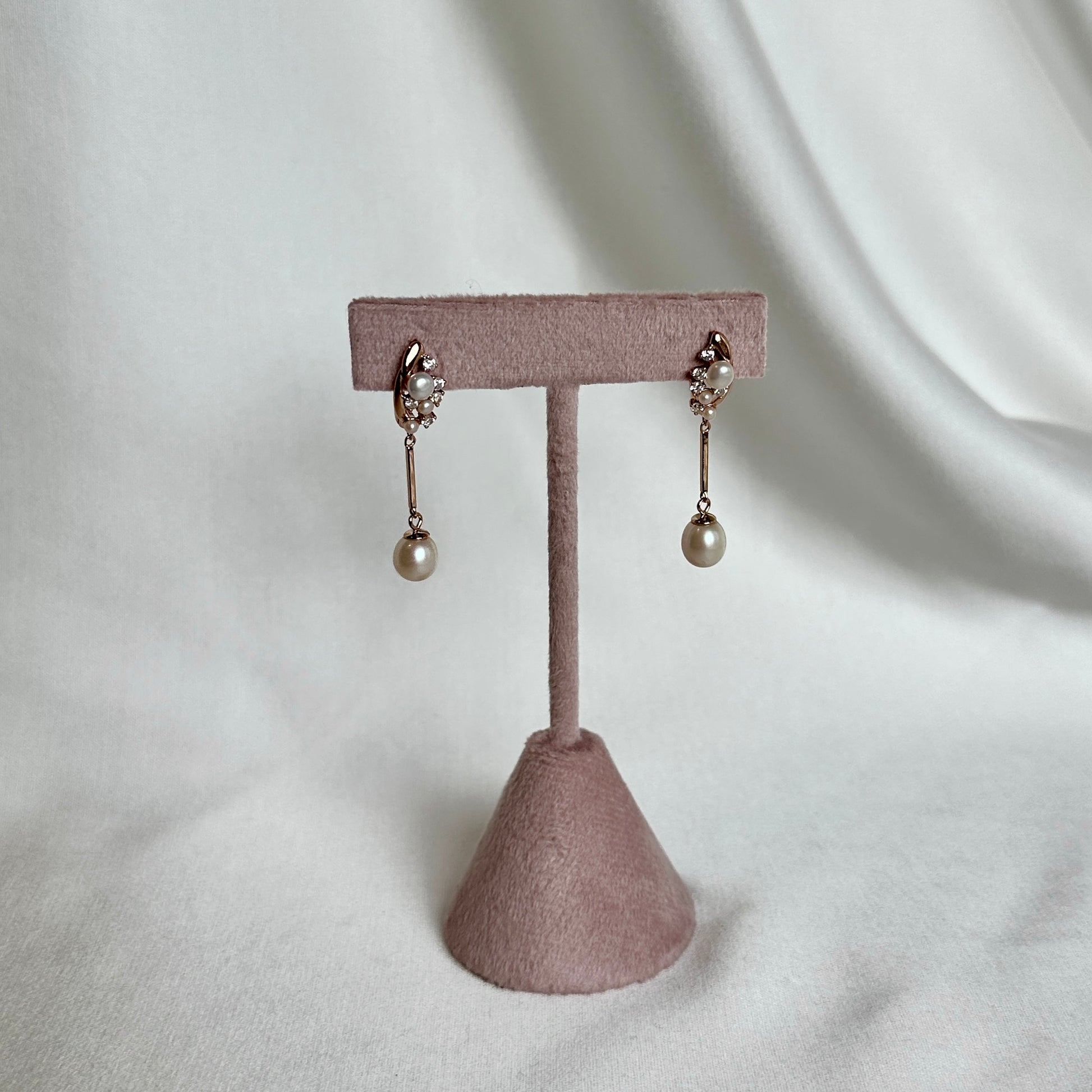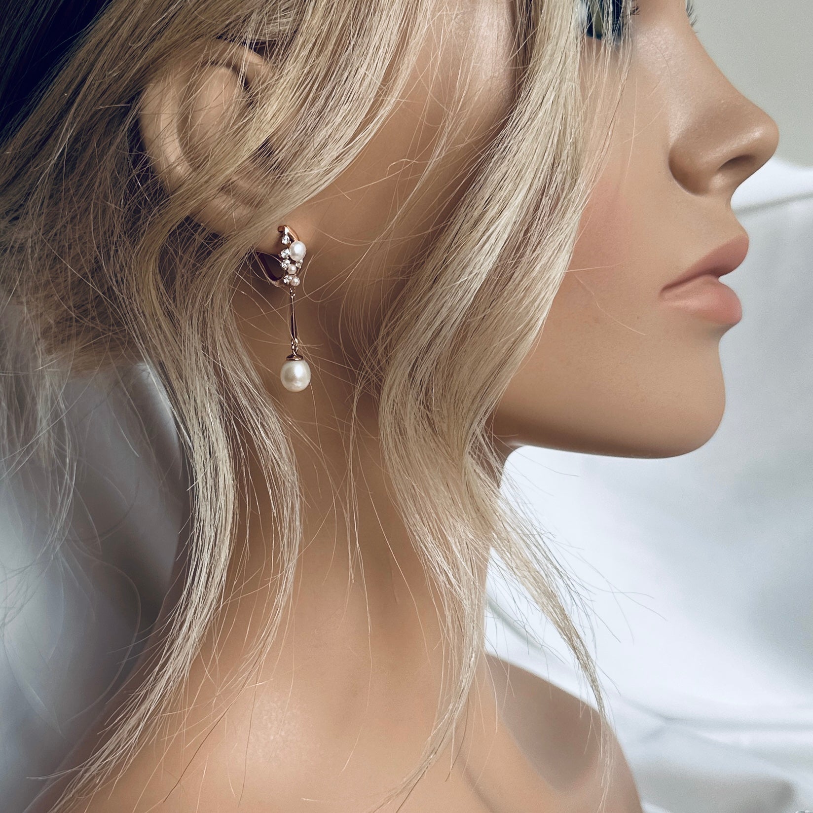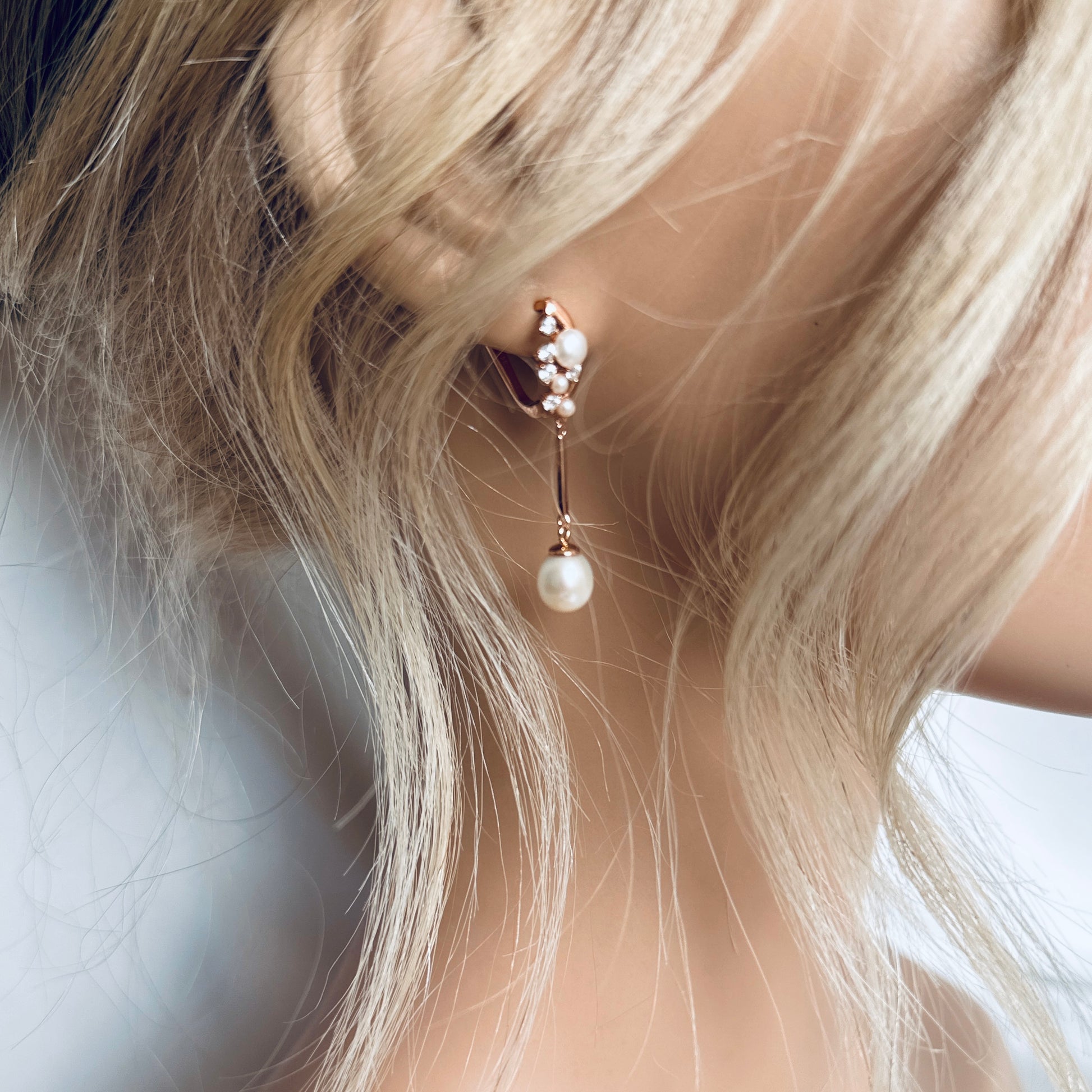The Fiona earrings in rose gold feature a freshwater pearl and eye-catching crystal detail, suspended from a delicate drop. A beautiful choice for any bride looking to make a stunning statement on her special day.