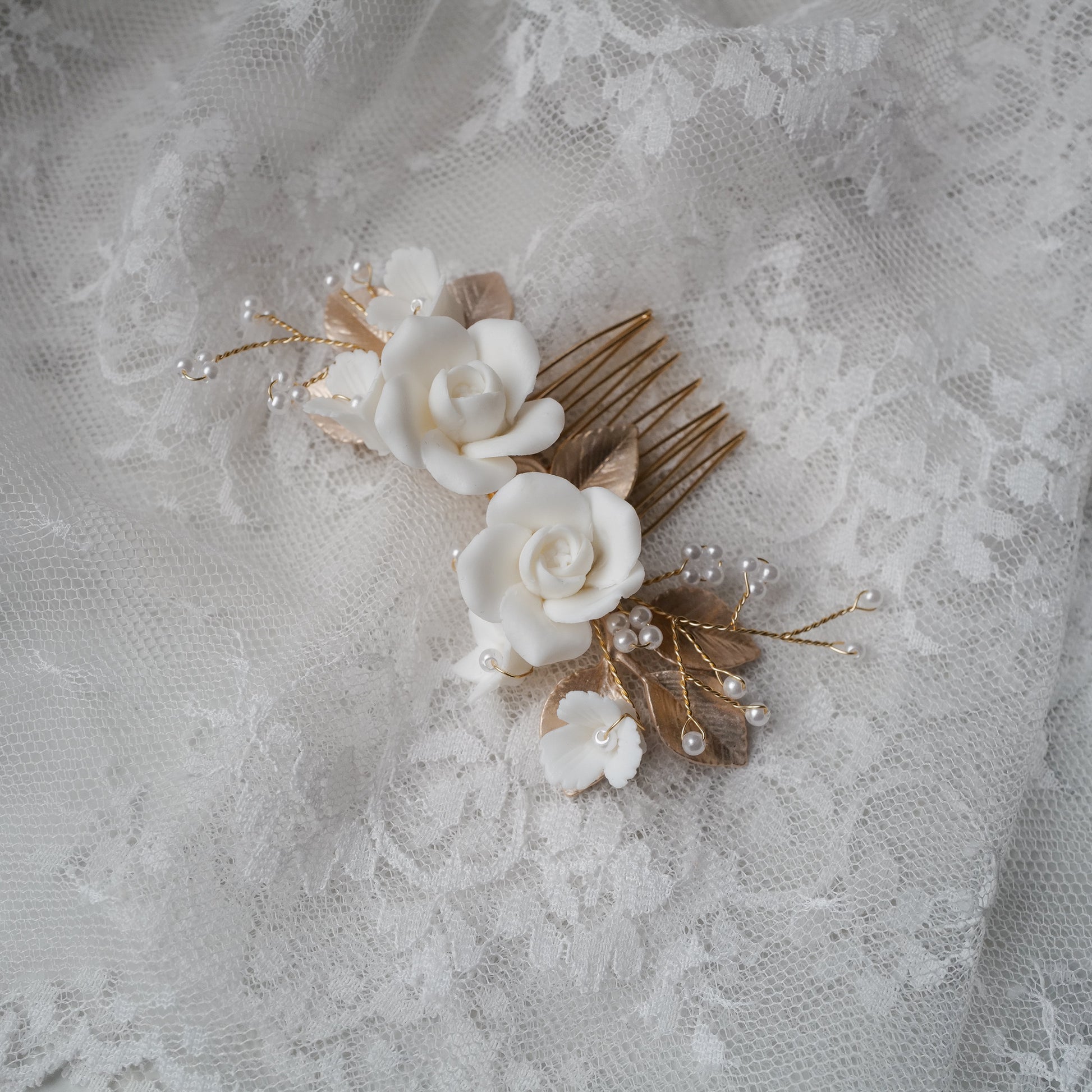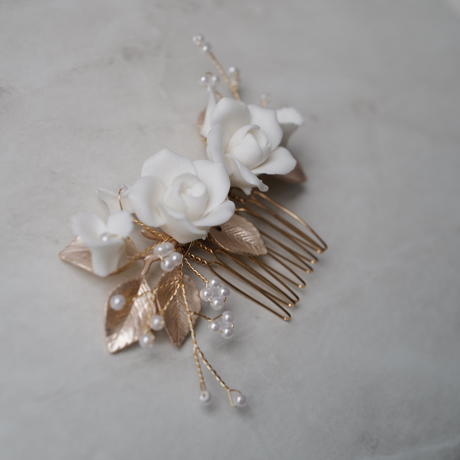 Featuring porcelain flowers, pearls and adorned with gold leaves and her a stunning addition to your hair style. She would look beautiful worn alone , with plain or pearl veil would be exquisite.